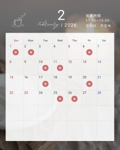2026/01/24 お知らせ 2月の定休日 ◆2月の定休日◆1(日)、2(月)、6(金)、10(火)、11(水)、17(火)、20(金)、25(水)、26(木) 体と心をととのえる時間を…。 ご予約お待ちしております。
