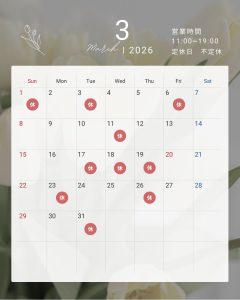 2026/02/24 お知らせ 3月の定休日 ◆3月の定休日◆1(日)、3(火)、6(金)、11(水)、17(火)、18(水)、19(木)、23(月)、26(木)、31(火) 年度末の疲れ・寒暖差・花粉…。毎年この時期に体調を崩される方は、“今”整えておくと4月の年度初めを心地よく過ごすことができます。 ご予約お待ちしております。